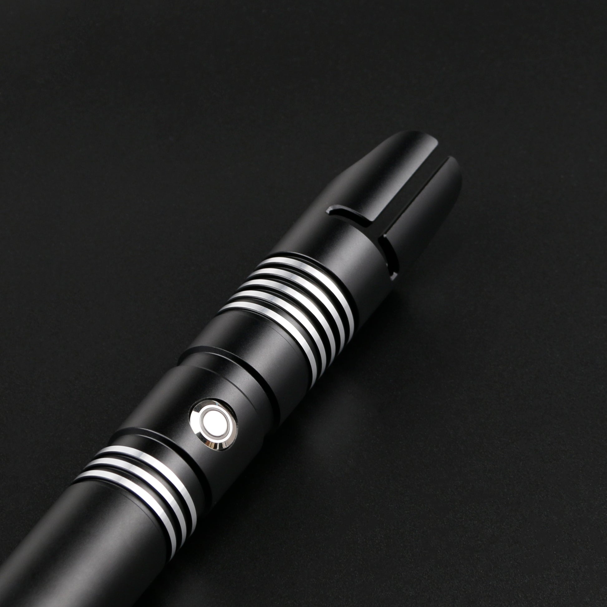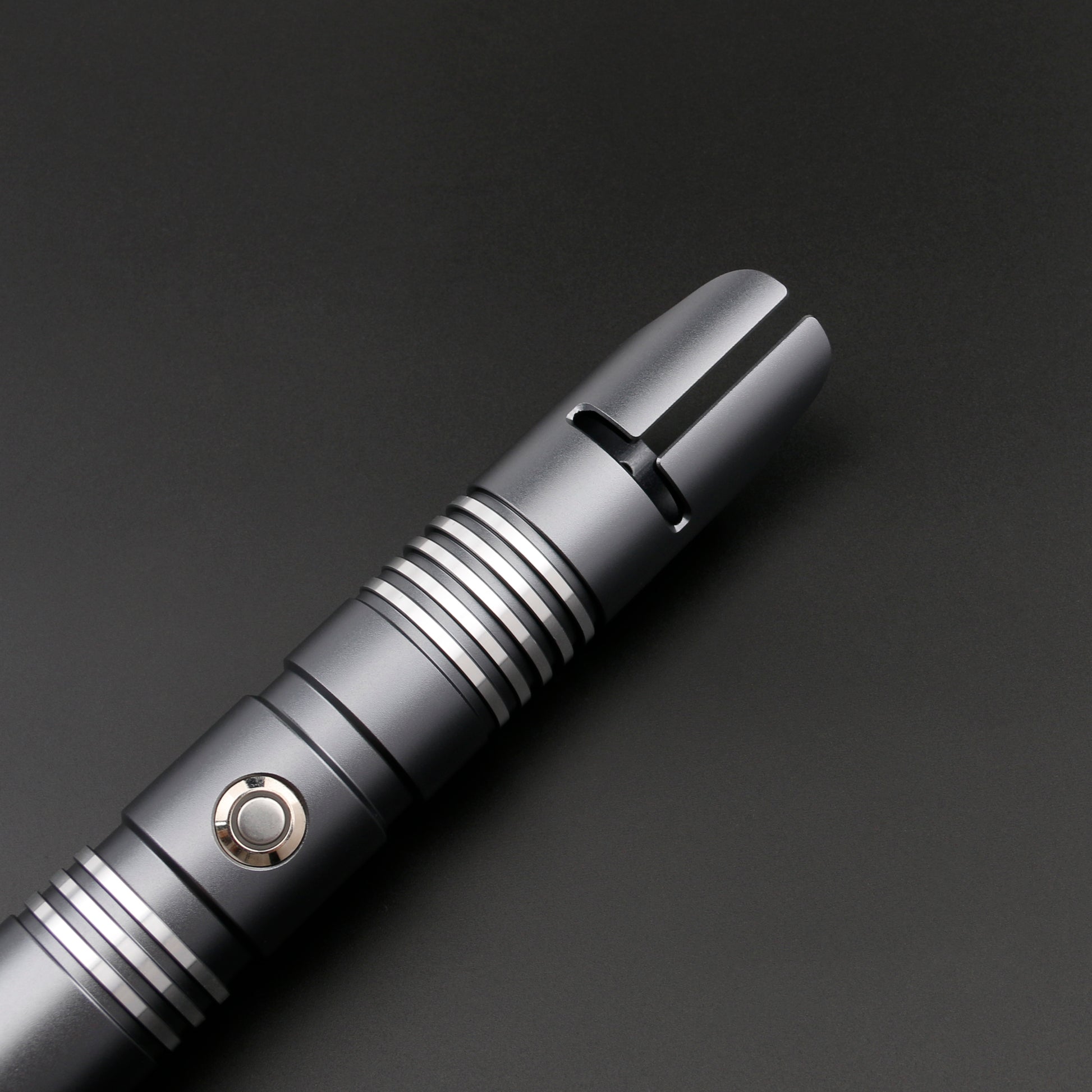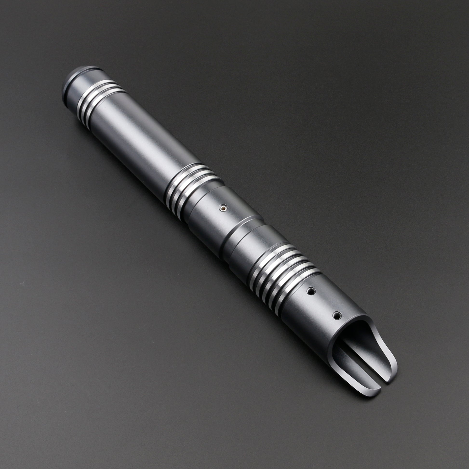 La empuñadura del sable láser está diseñada para ser especialmente duradera y transmite una sensación de fiabilidad y fortaleza con materiales robustos y un diseño ergonómico. Las líneas limpias y los elementos tácticos de la empuñadura la convierten en un arma fiable en manos de un ejecutor.